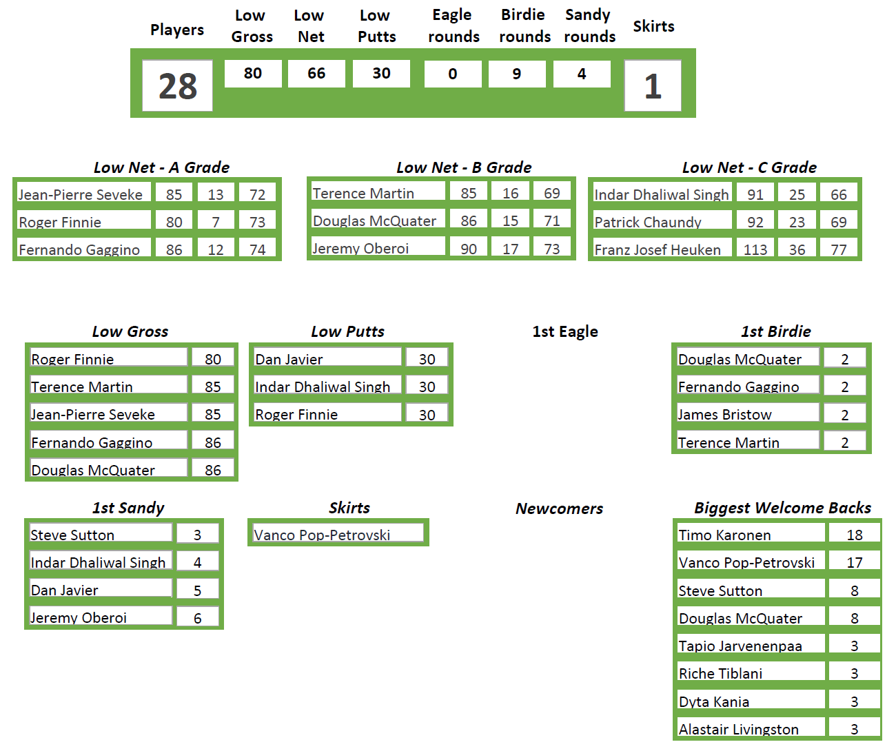 With so much going on over the Easter weekend and many of our players out of country, the turnout of 28 was surprisingly strong. Imperial again tested our players, with some players crashing down to earth after their recent runs of form. Of course, there were also some great rounds too. Big welcome backs to Timo and Vanco after decent absences, to Steve and Doug after wee sabbaticals, and Tapio, Richie, Dyta and Al who we missed when we blinked, but who get a mention here after their 3 weeks off. As always, Imperial provided a safe and comfortable space for the after match.