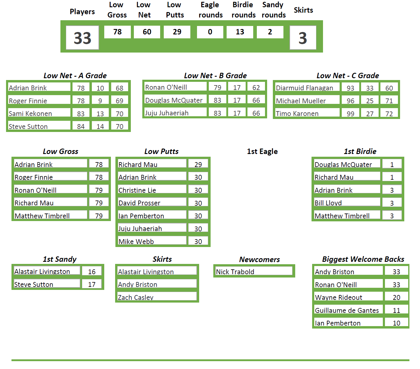 The round of the day went to the fast improving Diarmuid with a net 60 – great to see – with fellow Irish boy band member Ronan singing the same tune with a fine 62. Ronan is one of the longest hitters we see from time to time, prone to use several fairways to get to the green, but clearly on target today, well done mate! Adrian (missing from pics below) shot a fine 68 to take Low Net A grade, shooting the lowest gross score of the day at 78, along with Roger, who was awarded Low Gross. For those who don’t know, Tee Set is a “net golfing society”, so Low Net takes precedence in prizes. Dougy burst out of the gates to take first birrrrrdie on the first hole, along with Richard, but he also had Low Putts, so one prize was enough, and he’s smiling! Al had the first sandy par but was not around for photos.