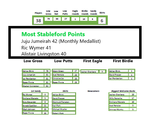 A good and easy to manage field of 38 players, with no newcomers but notable welcome backs, especially Jochen who had an eagle after missing us for 20 weeks. He no doubt brought out his customary post-match cigar to celebrate that one!!