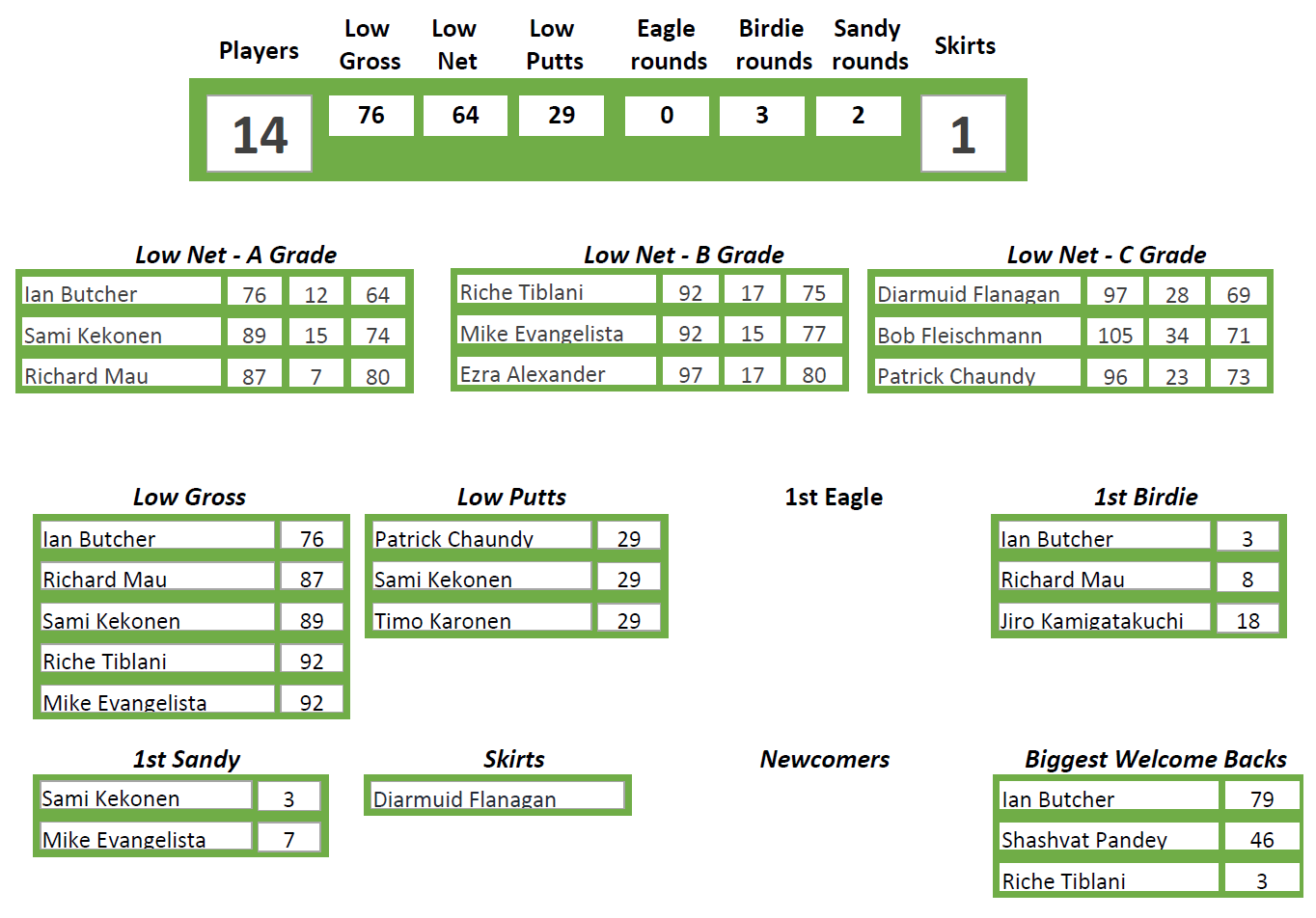 The highlight was of course Ian coming back to the country and to Tee Set after 79 weeks away and bringing back his best golf, a round of 76 (nett 64) to scoop the limited prize pool. It wouldn’t be a post without a smile from Richard, so he’s in and Mike stuck around to pick up B Grade. Diarmuid is featured here “done two ways” – as C Grade winner and as our only skirt, which he wore with style.