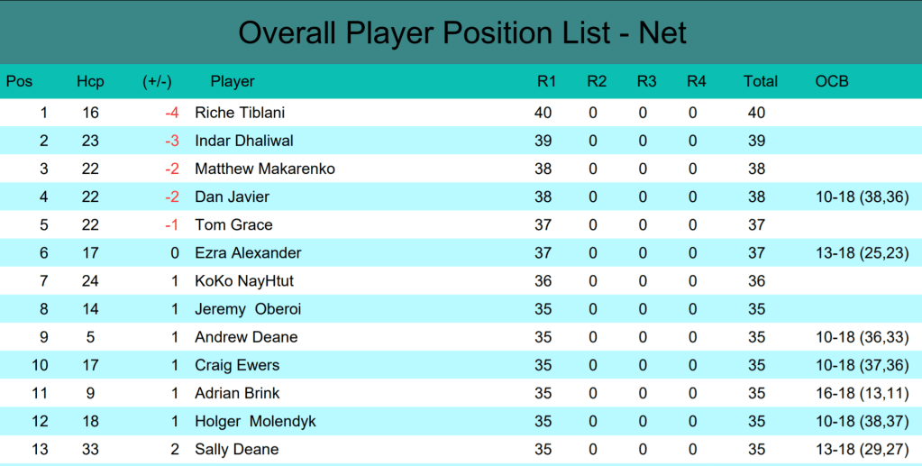 Again the event was stableford format and Riche led the field in with 40 points, followed by Indar with 39 points and Matthew and Dan on 38 points. Sally led the ladies in with 35 points and Andrew again had the lowest gross score with 78.
