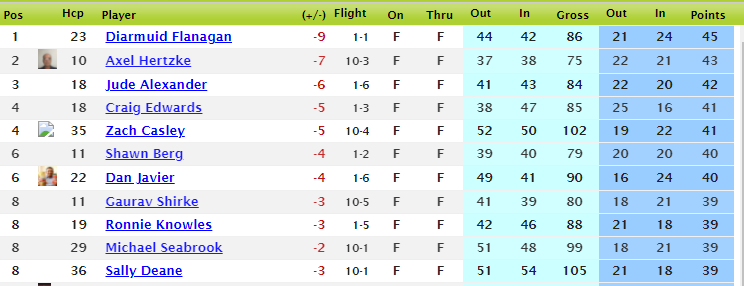 The event was a stableford with 18 players scoring par or better. A special mention to Craig, of the less vertical variety, for his best nine ever of 38 gross (25 points) on the front nine, including three birdies in a row. Alas, concentration and energy waned a little on the back nine and he narrowly missed the prizes. Strong rounds also by Zach, Shawn and Dan, which most other weeks would have earnt them prizes.