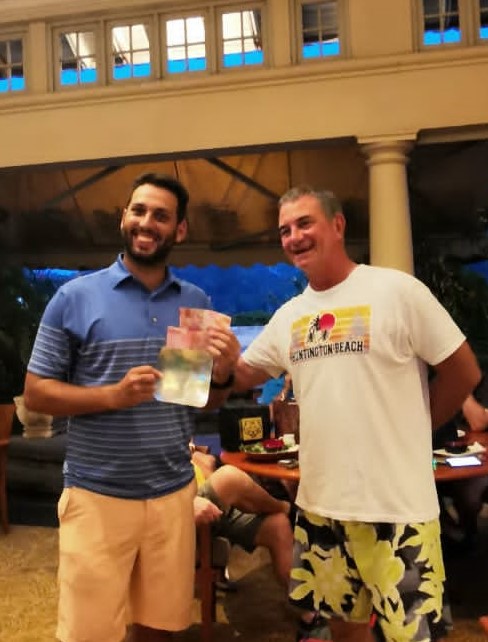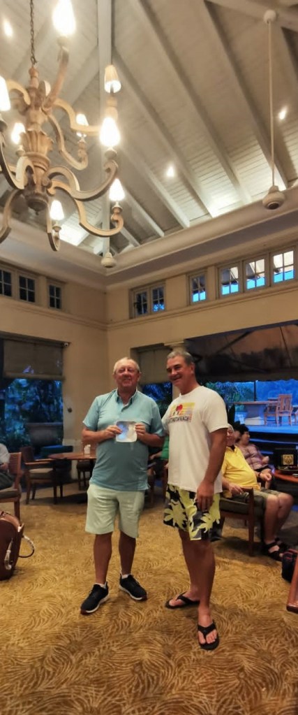 A special presentation went to MJ for winning the Monthly Medal last month, when we were still prevented from conducting presentations. As you will note, the chandelier has not been cropped in this shot, nor have Bill’s flip flops, both are left in frame as design icons to match the September winner’s iconic stature. He is the only player since past President Pastis to maintain the two tone, one colour ensemble every week.
