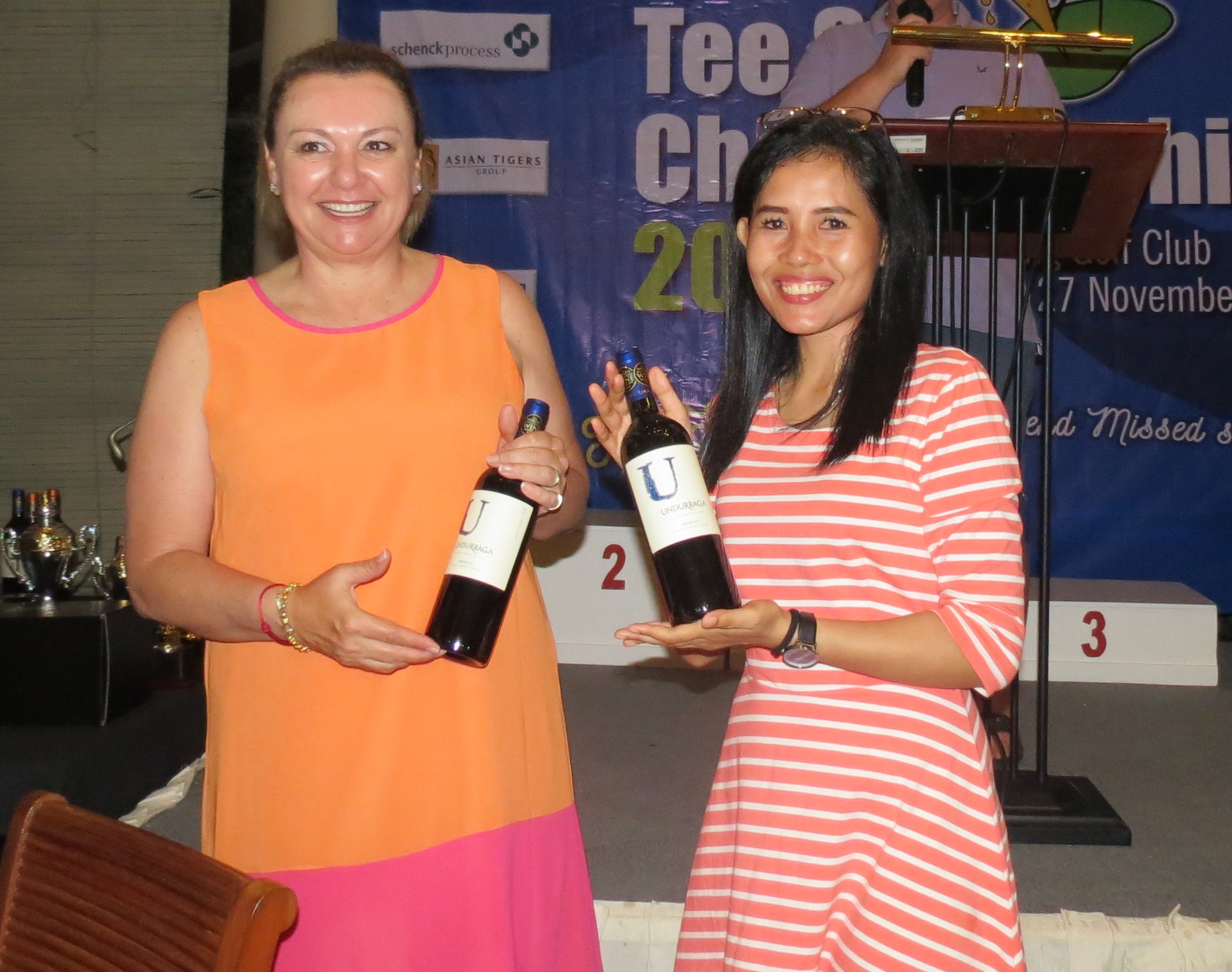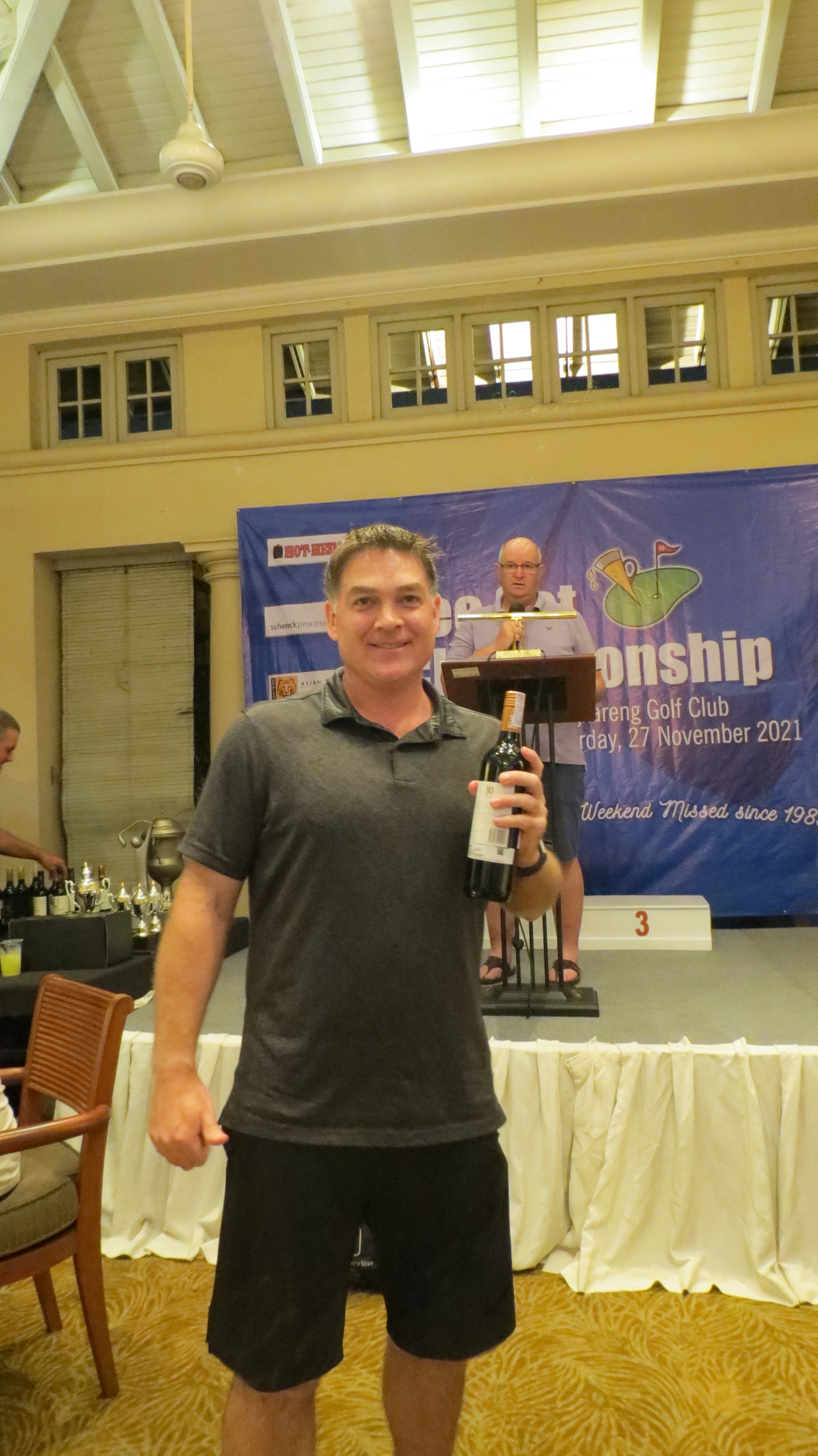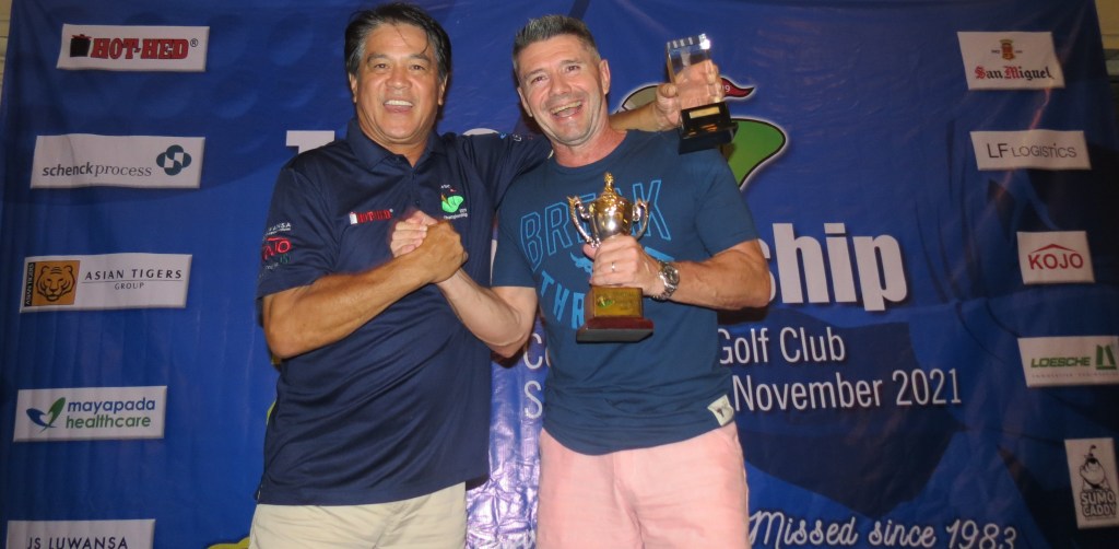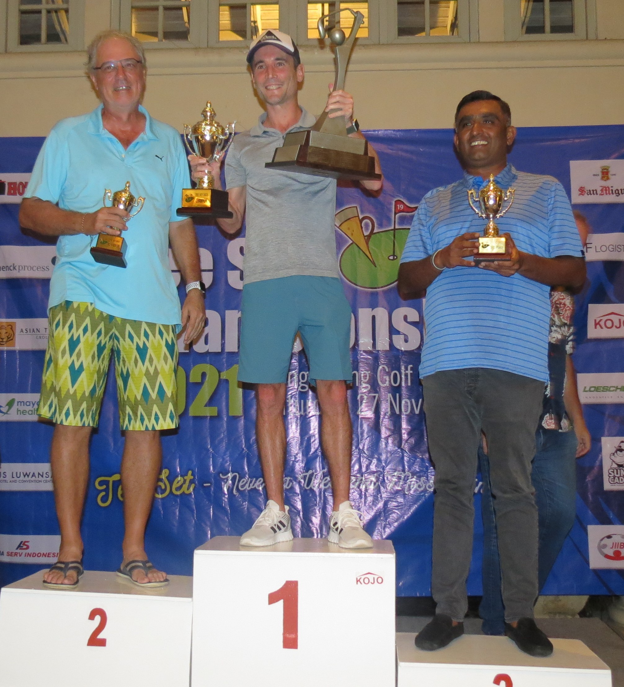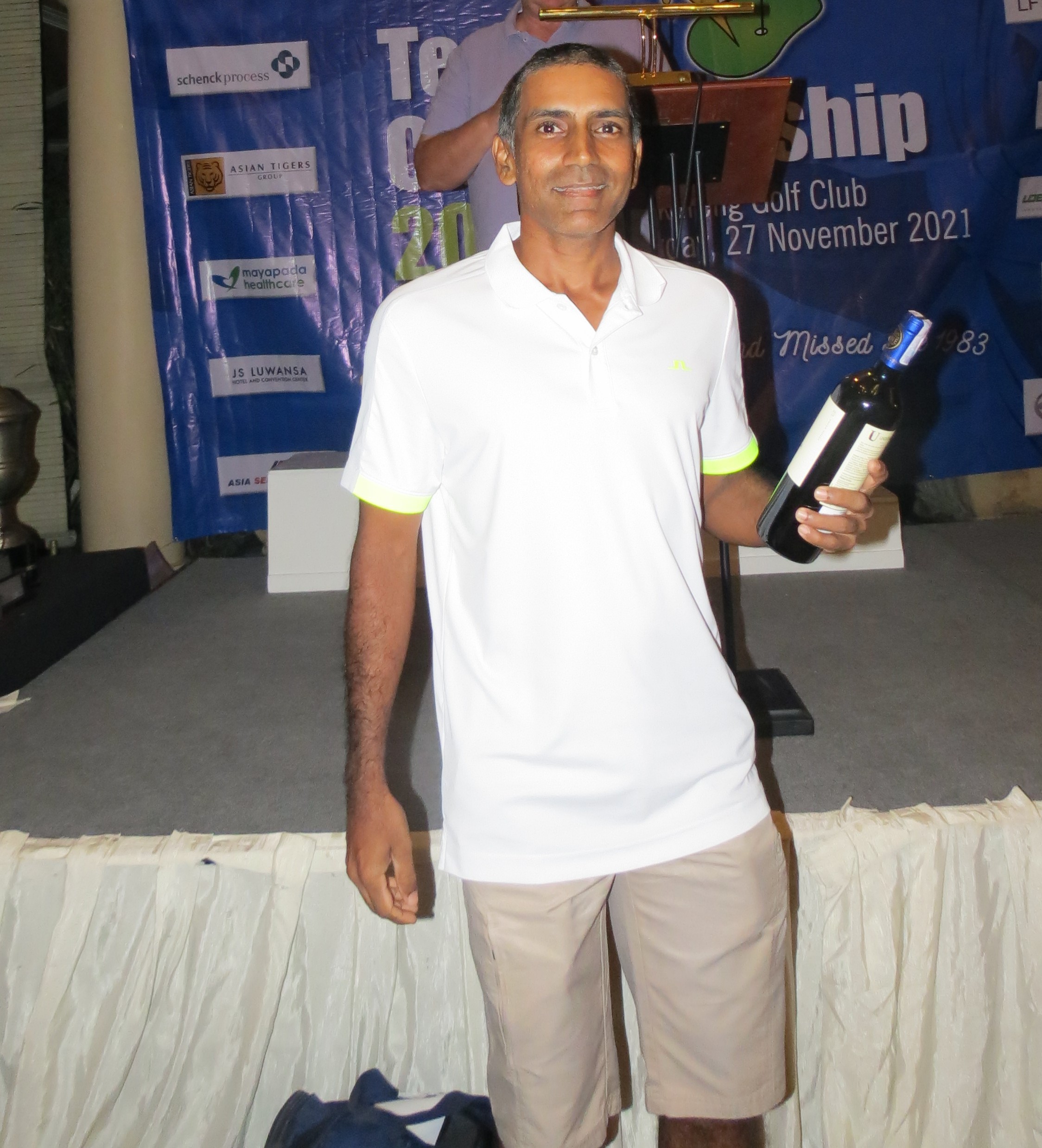 We invited reigning champ, Cucu Chandra, to present the trophies. Both low net and low gross awards required a countback, which is always tough in the middle of a party, but after some filling by the MC and some calculations by the brain’s trust, third place was confirmed for Murthy (69), Fernando took second on 68, and with the same score and the Tee Set Champion for 2021, was Eric Mary.