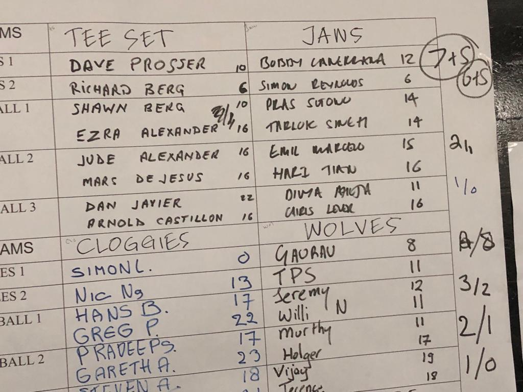 Tee Set found the going a bit tough against JAWS and wet down 8/2 . If you can make head or tail of the score board I have provided a snapshot. As so often happens one match was decided on the last put on the last hole. Bad luck Dan and Arnold but it sure was close. Thank you to all our JIL team and trust that Tom will be able to assemble a great team for next month.