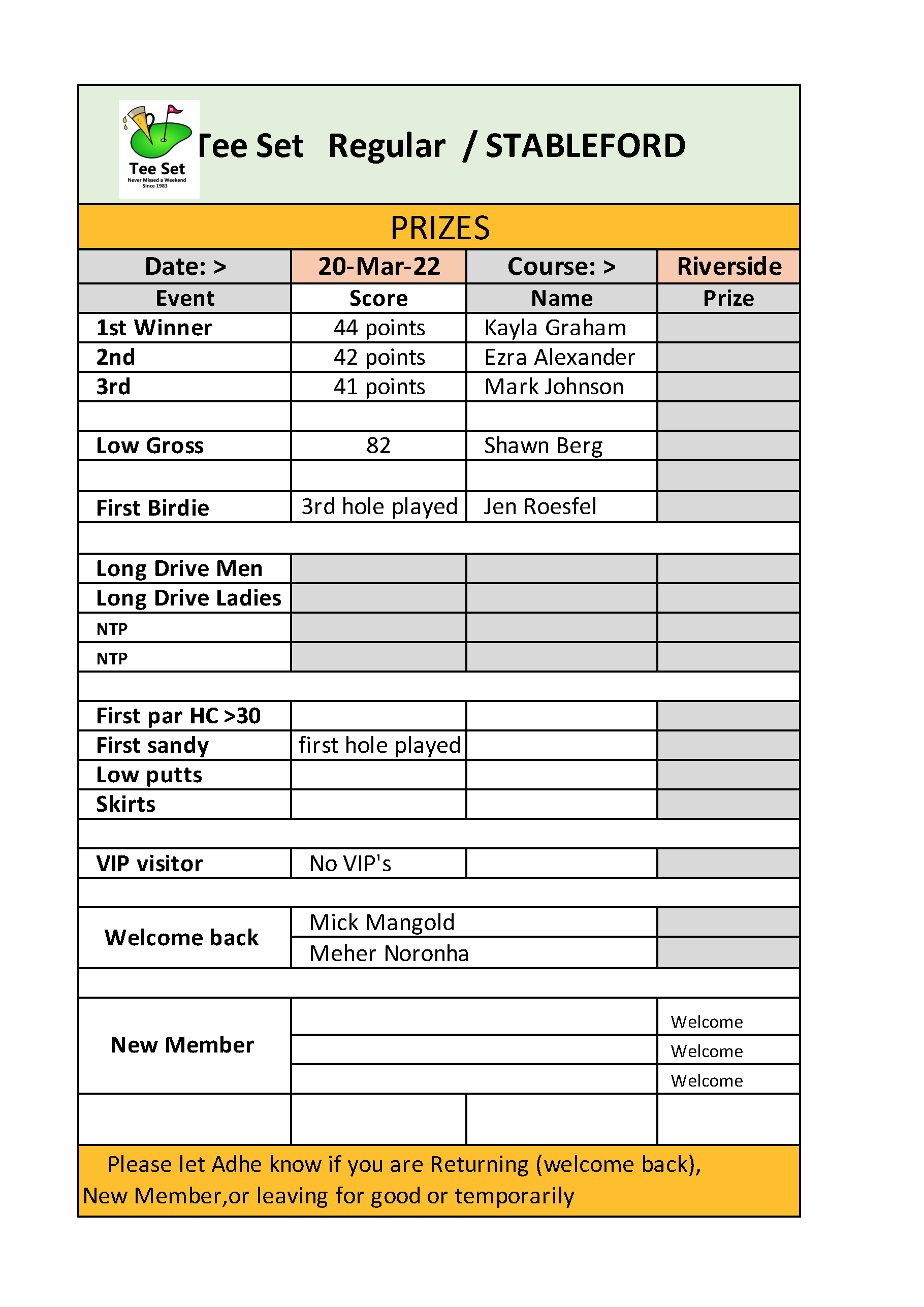 Low gross Shawn, Jens First Birdie and welcome backs Mick and Meher