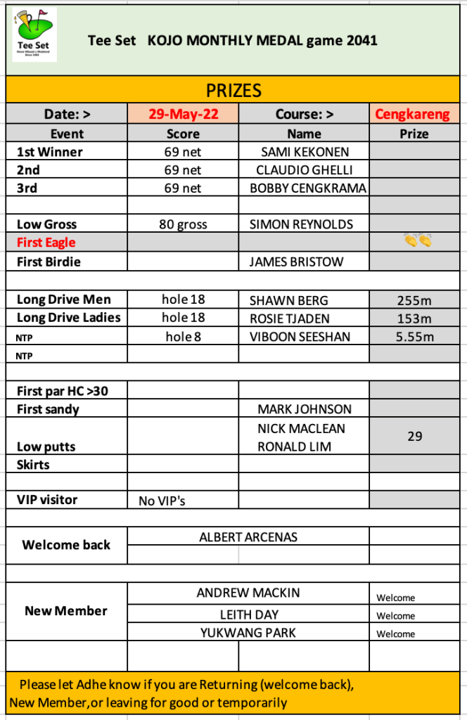 Cenkareng giveth and Cengkareng taketh away. On the plus side a beautiful golfing day with the course in super shape despite the recent downpours. On the minus side the overbooked morning and/or general snail’s pace of play left many Tee Setters frustrated with some finishing in the dark. However, there was a variety of sparkling shots worth noting: