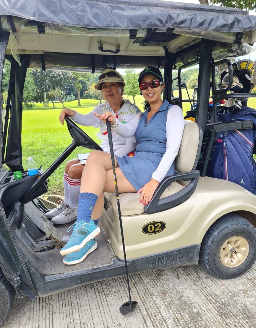 Rosita and Eli take advantage of the carts on one of Jakarta’s flattest courses.