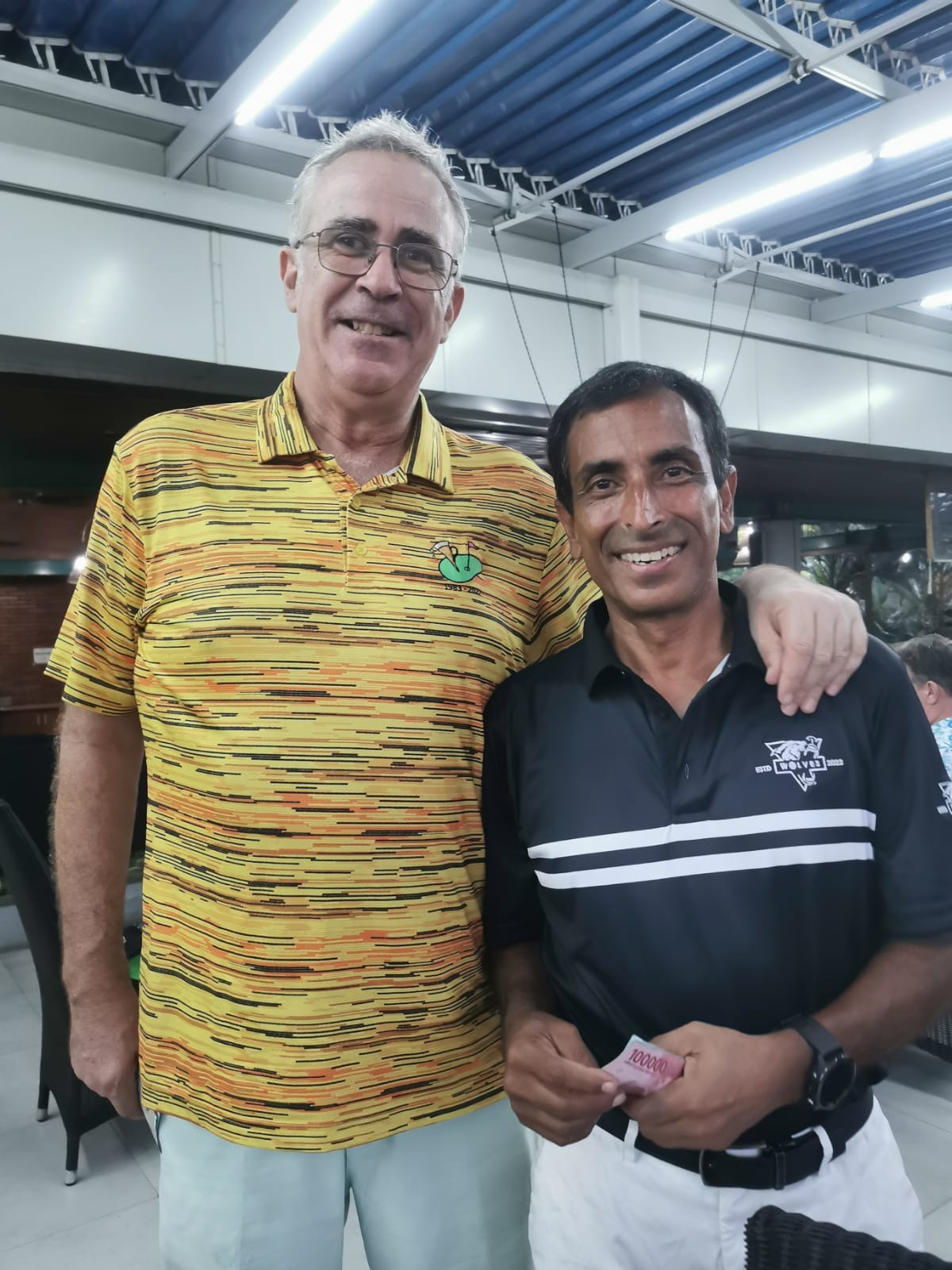 Jens had the first bird on hole 5. An old photo as Neil won diddly squat last Sunday. Well done Jens.