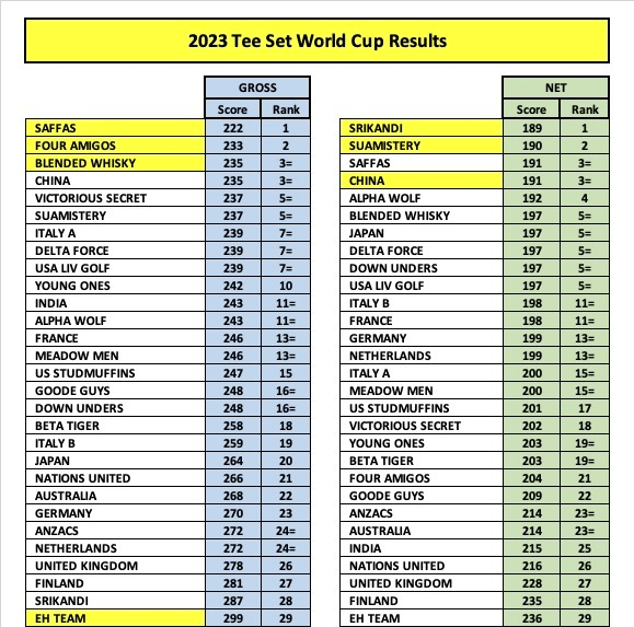 Over 20 nations were represented in this years Cup spread over 19 teams leading it to be the biggest World Cup yet. A big thank you to Riverside for herding 115 stray teeset cats onto the course at the prescribed time. The morning golfers were a bit slow, so after a short delay sorting caddies and we were away. The course was in great condition and the greens had a few tricky pin placements. The President felt some of the tree placements were also a bit dodgy and some of the ravines could have been moved. Reports were coming in that eagles were being scored with gay abandon (please note the original meaning of gay as an adjective), birdies were coming thick and fast and swearing by the President subdued due to being in the presence of a lady. Golfers pretty much got around in regulation time and the format was a winner.