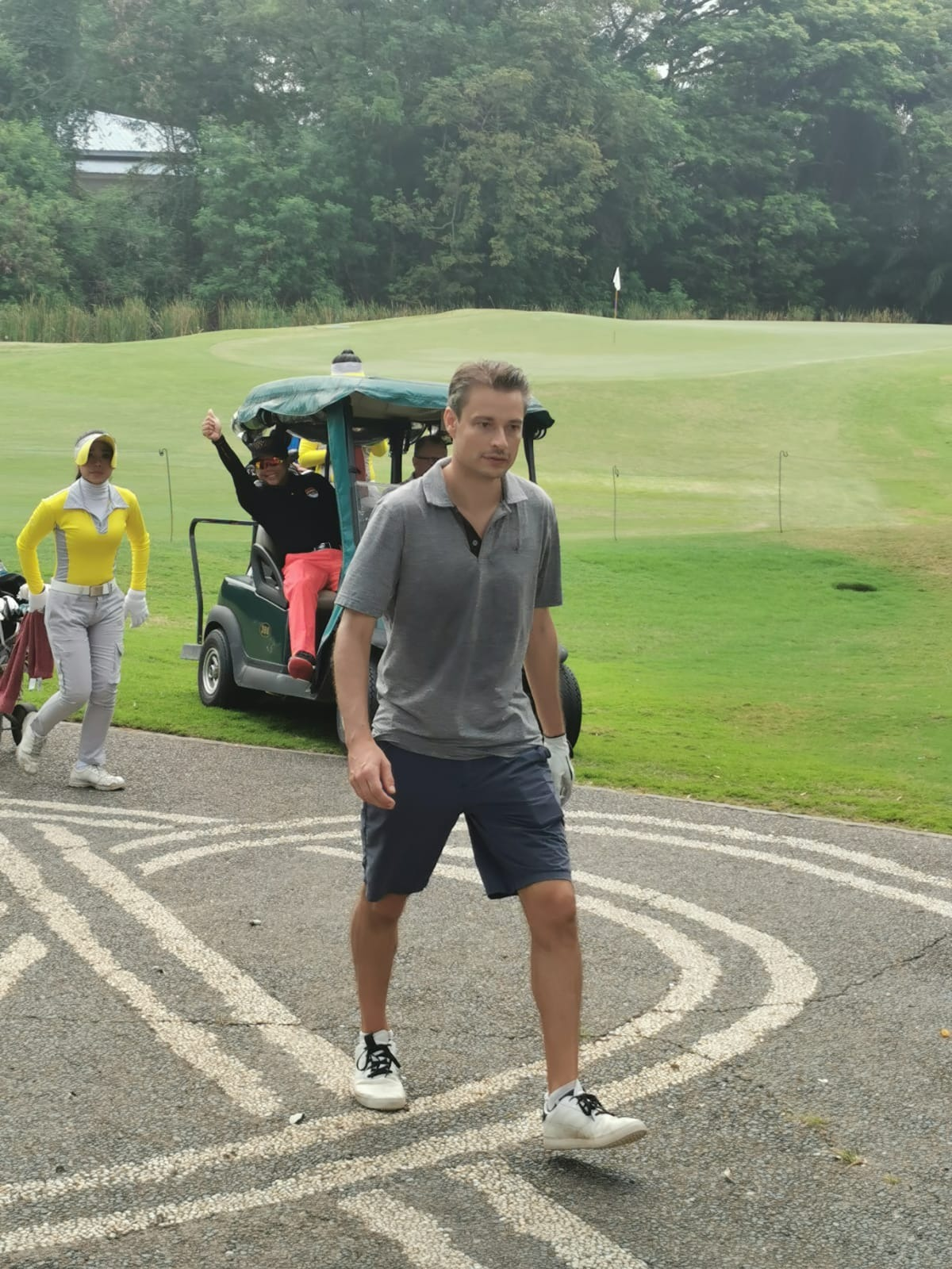 Warming up before teeing off. Do the Hokey Pokey