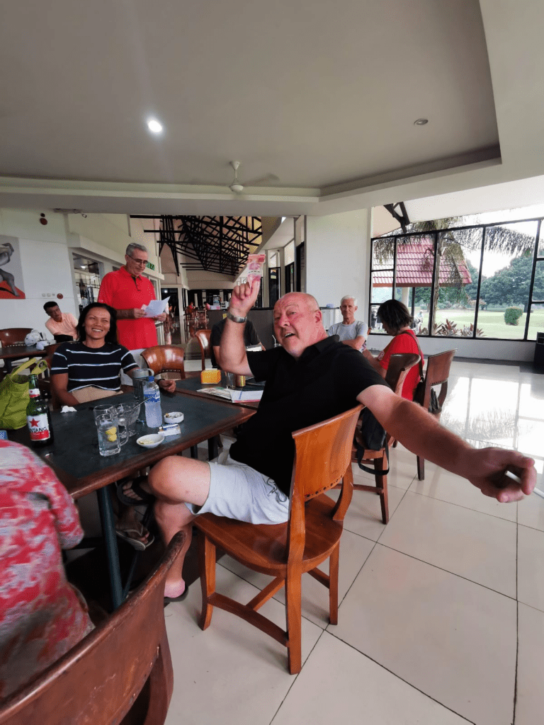 The course for most of the day had the joyful tunes of dangdut music in the air. Three signs of being in Indonesia too long, 1. You think the Kijang/Innova is a good car, 2. When you dance your thumbs are up 3. You don’t notice the traffic. Talking of dancing and music, the laughter from the ladies flight of Cucu, Rosita and Eli was frequently heard from behind hedge rows. The ladies don’t invoke divine intervention on the golf course they just have fun.