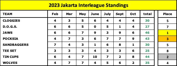 Our JIL captain, Dean, posted a season end victory over the DOGS. It was a tough start to the season but the team grew in strength and confidence as the season progressed and but for a couple of narrow loses could have finished higher up the table. Next season presents a challenge to the mighty TeeSetters to hit the ground running with all guns firing. So please step up to the challenge next year and help propel the team to victory. A big thanks to Viboon, Geoff, Jeff, Shyam, Nicolas, Sam, Albert & Dean and all the other players who stepped up during the year.