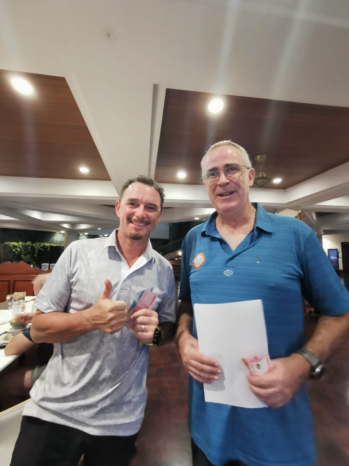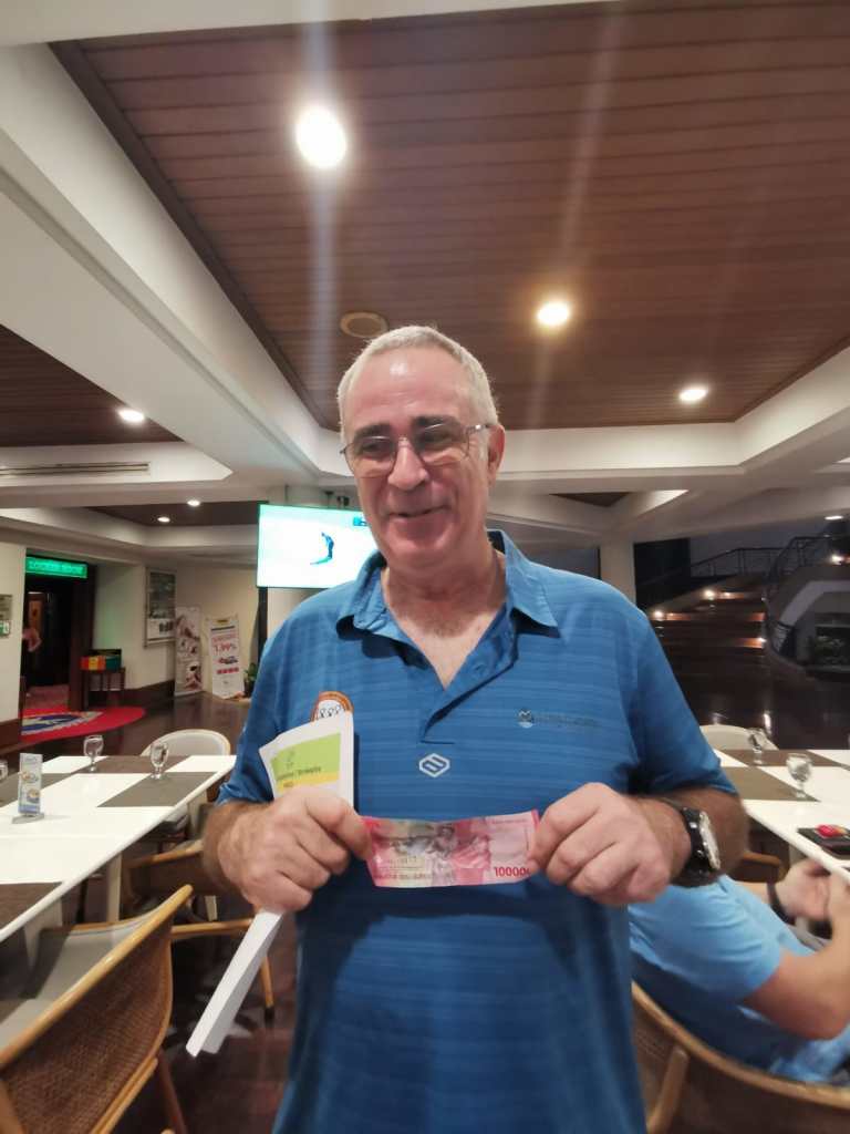 As I was walking through the club house I saw a man who wasn’t there. Holger, anyone see him? The guys that played in his flight did, but no one else. A shotgun start off several holes on the back nine ensured we’d have a rather fast round. Then the rain came down, long enough to drench the A flights on each hole as the B flights safely sheltered. The rain Jakarta had been waiting for finally arrived but lasted 15 minutes with another 5 minute shower late in the round. The humidity after the first show was off the charts and my glasses were fogging up which enabled the ball to land safely on the green at the opening par 3. The Seabrooks V the Verdenals, matchplay of the century. The women had no interest it seemed as they happily golfed away. Whereas the men strutted around on the teeboxes like one legged peacocks. The match was sealed on the hole were the two over tense blokes both managed to lose multiple balls and hit scores close to double figures whilst the ladies unknowingly were putting for victory. A great game.