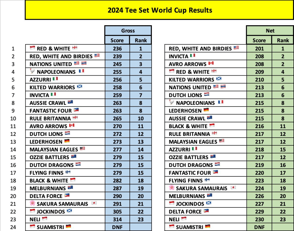 We had a full field of 24 teams a nd speed of play was important. The Kilted Warriors disappeared into the distance first off the 10th and were home just on 4 hours. The rest took their time, particularly the Napoleonians who disappeared into the background after 1 hole behind the Melburnians. A little bit of rough weather saw a short delay for any team on the course after 4.10pm. Most importantly all were finished before dark and now it was up to the scoring Maestro to do his magic. Thanks everyone who sent me their score cards they went no further, as I was busy looking for my balls. Following instructions is not a strong suit of TeeSetters, we are social golfers and things just miraculously get organised by the Golf Fairy.