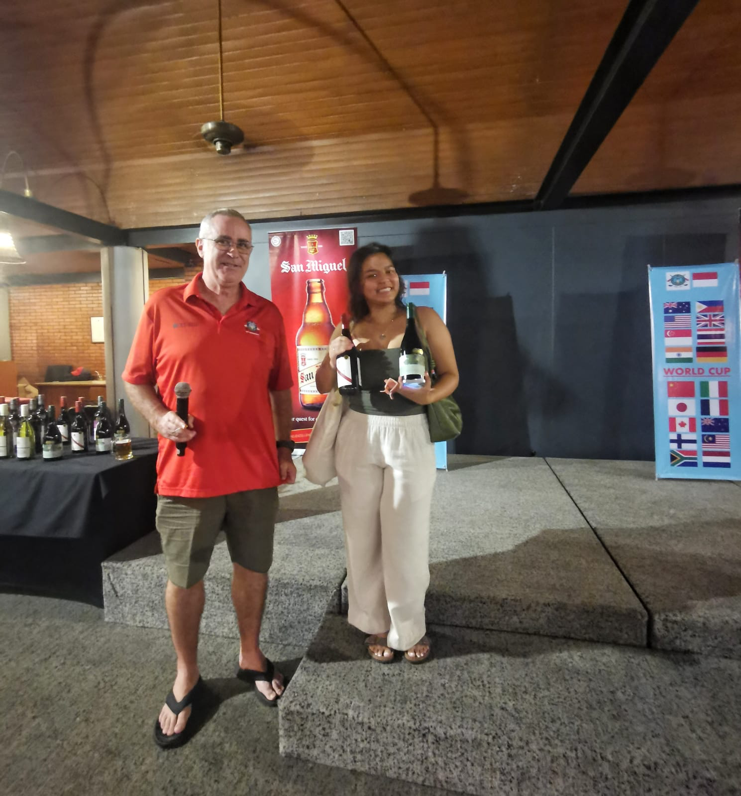 Kayla takes Ladies long drive 270 metres and nearest the pin 70cm. Later on to add to her prizes a carton of San Mig. On Friday it was a flight to Bali win. Party on Kayla.