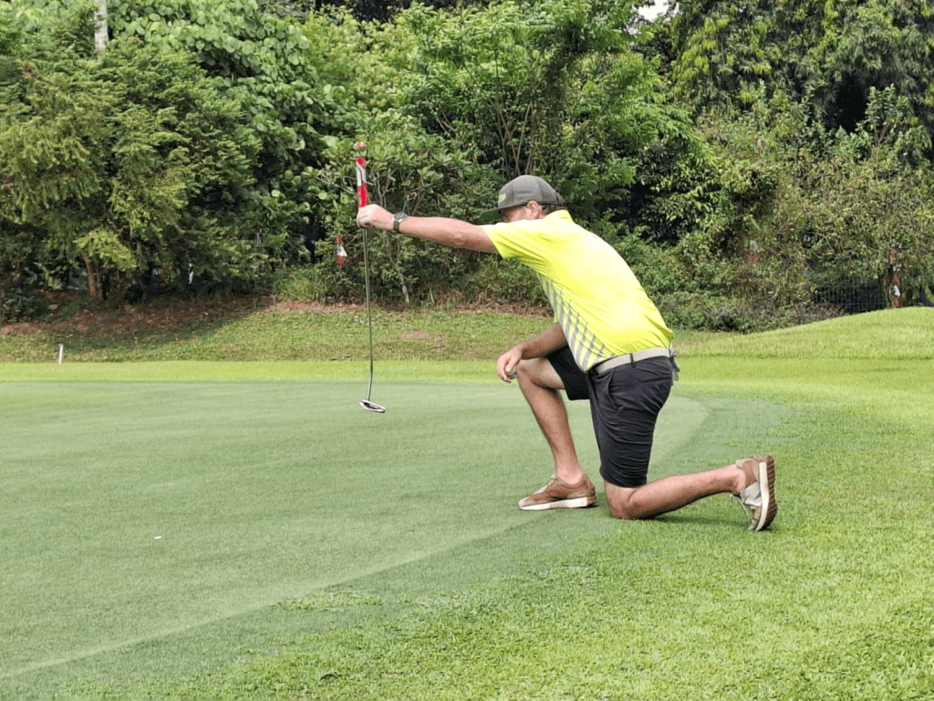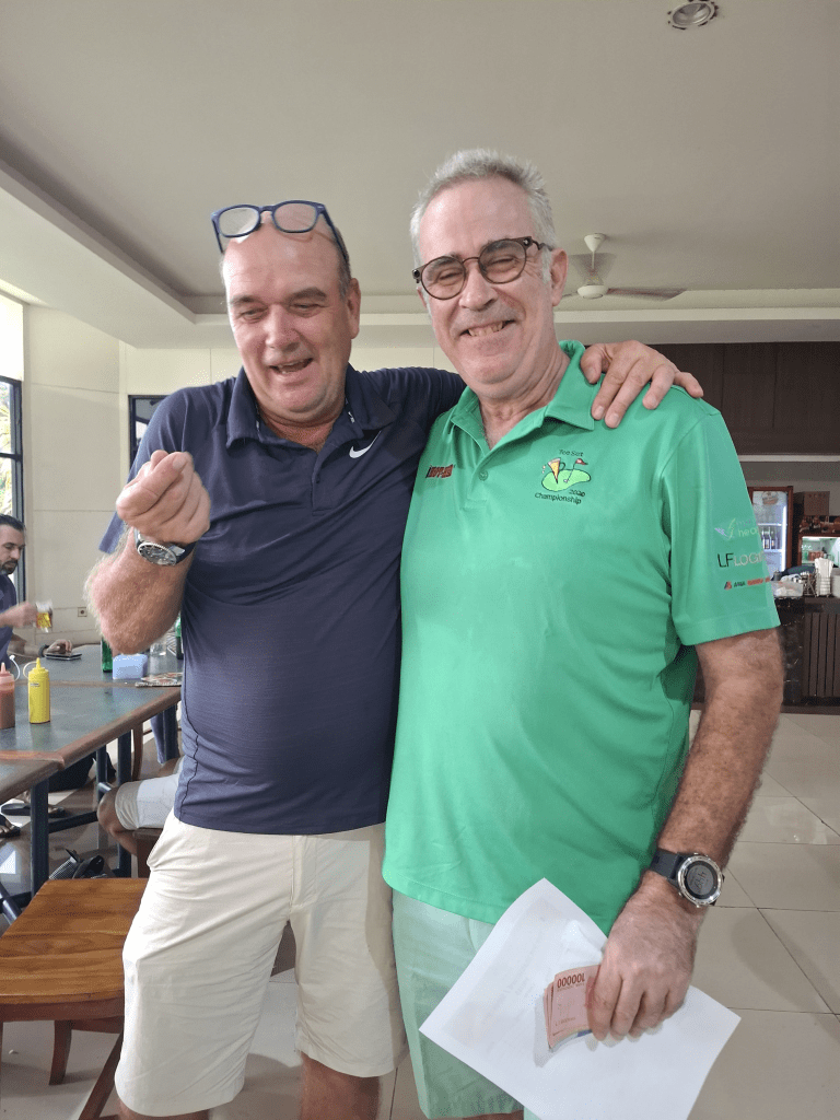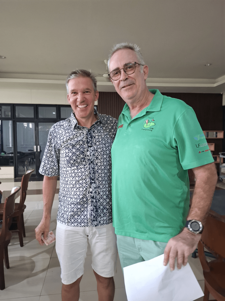 After a big turnout the previous week we struggled to get 6 flights for Cabe. Anyways those that showed up where not disappointed with the course in pristine condition and the greens nearly perfect. The weather was perfect with a stiffening breeze in the afternoon cooling the players and testing your irons in the swirling conditions. The Presidential Group teed off in the last group and made a wonderful start with 2 shots going OB and one just past the ladies’ tee luckily the President stepped up. After that we all settled down and got into a bit of a par rhythm. Which lasted 5 or 6 holes. My caddy was a bit deaf which went with his age, he used to play marbles with Suharto when they were both little boys. My wife asked for 2 senior caddies, i believe she got the one with experience and I got the one with age. He was looking hopefully at the electric carts and his glaucoma glazed eyes brimmed with tees as I informed him we were on Shank’s pony today. The old Digger did well and was normally not much further than 100 metres behind me, always with one of the three clubs I was contemplating using in his hand, he was a bit stiff to rarely get it right but he tried. A lot better than the previous weeks caddy at Riverside who did not try at all.
