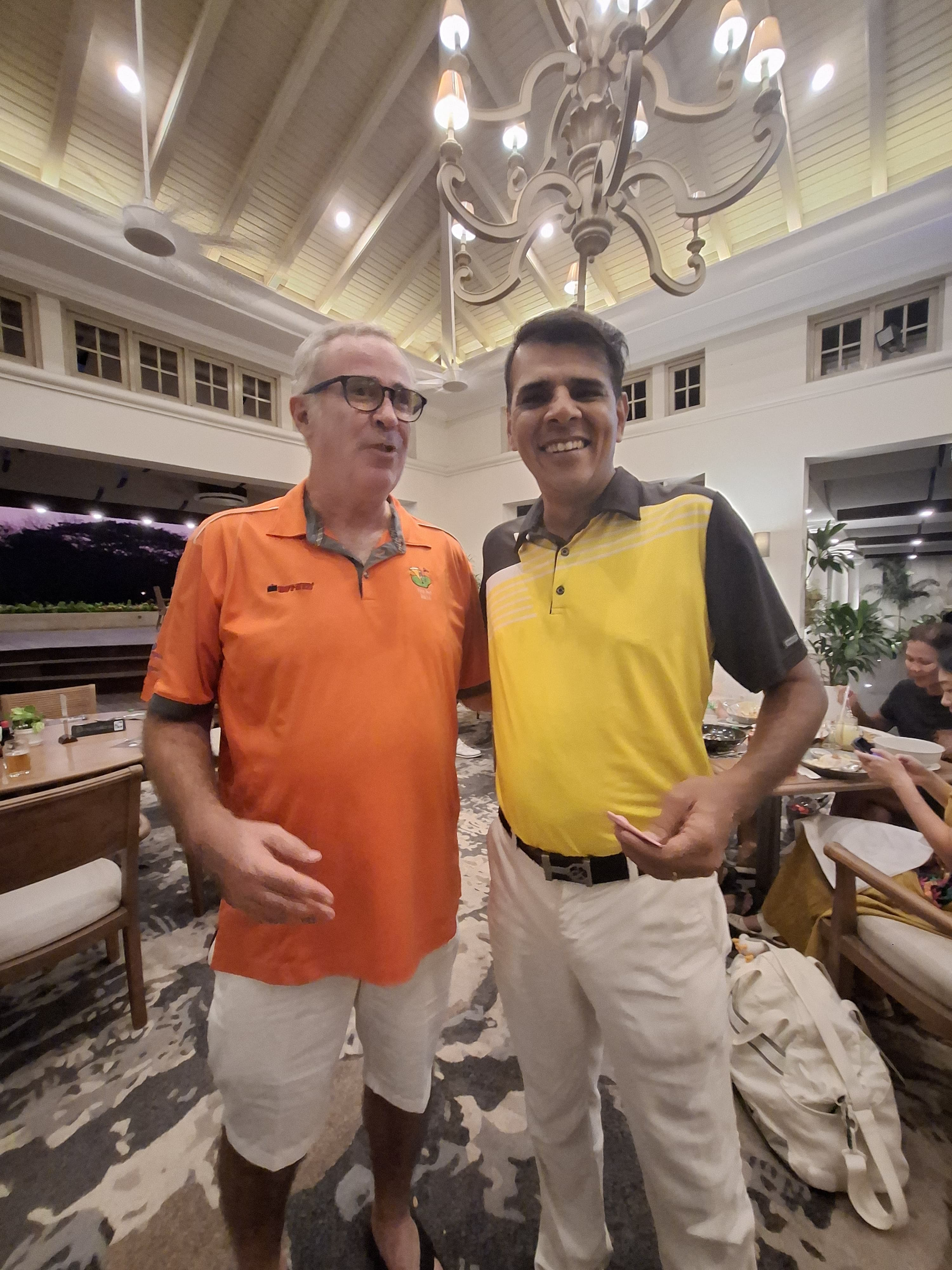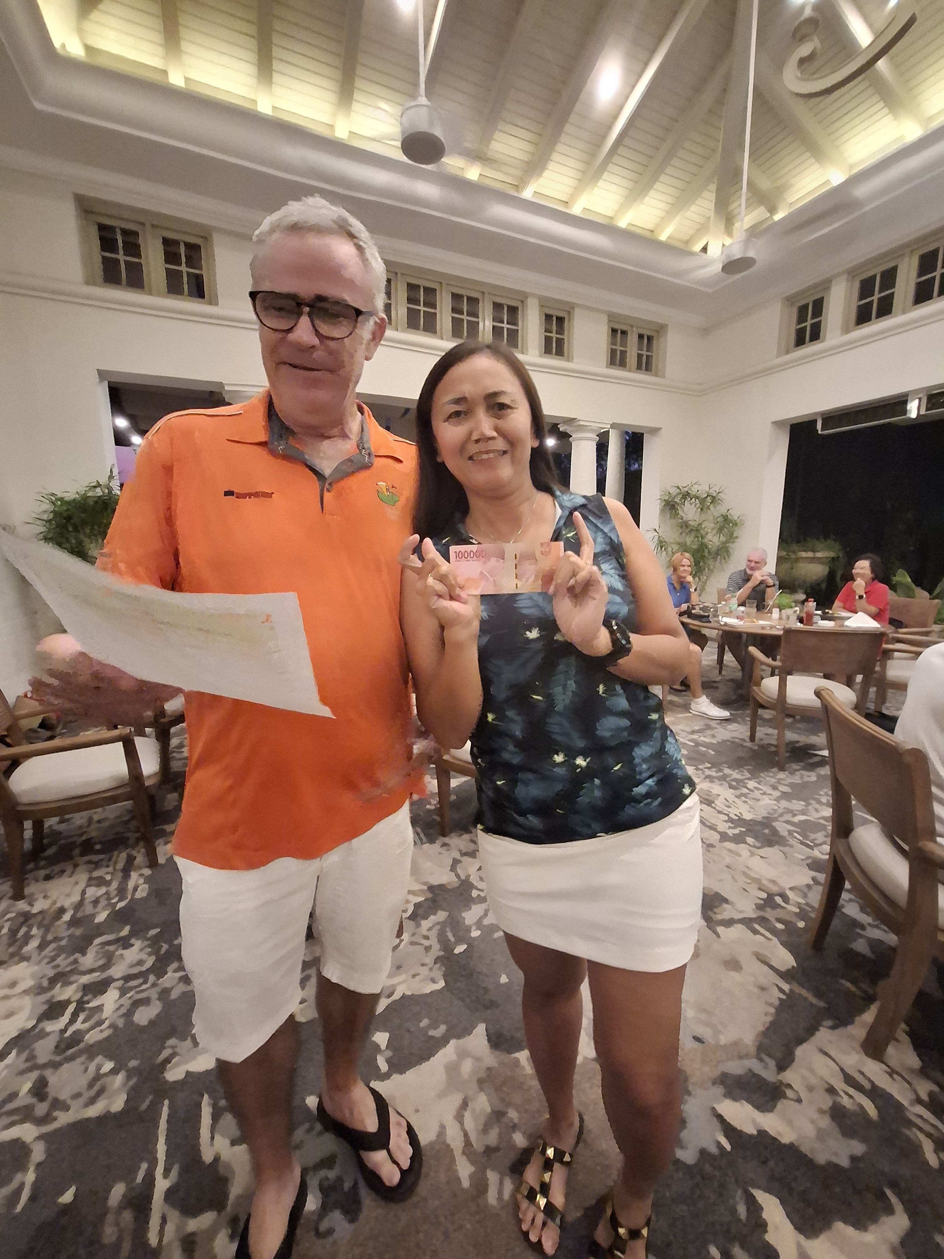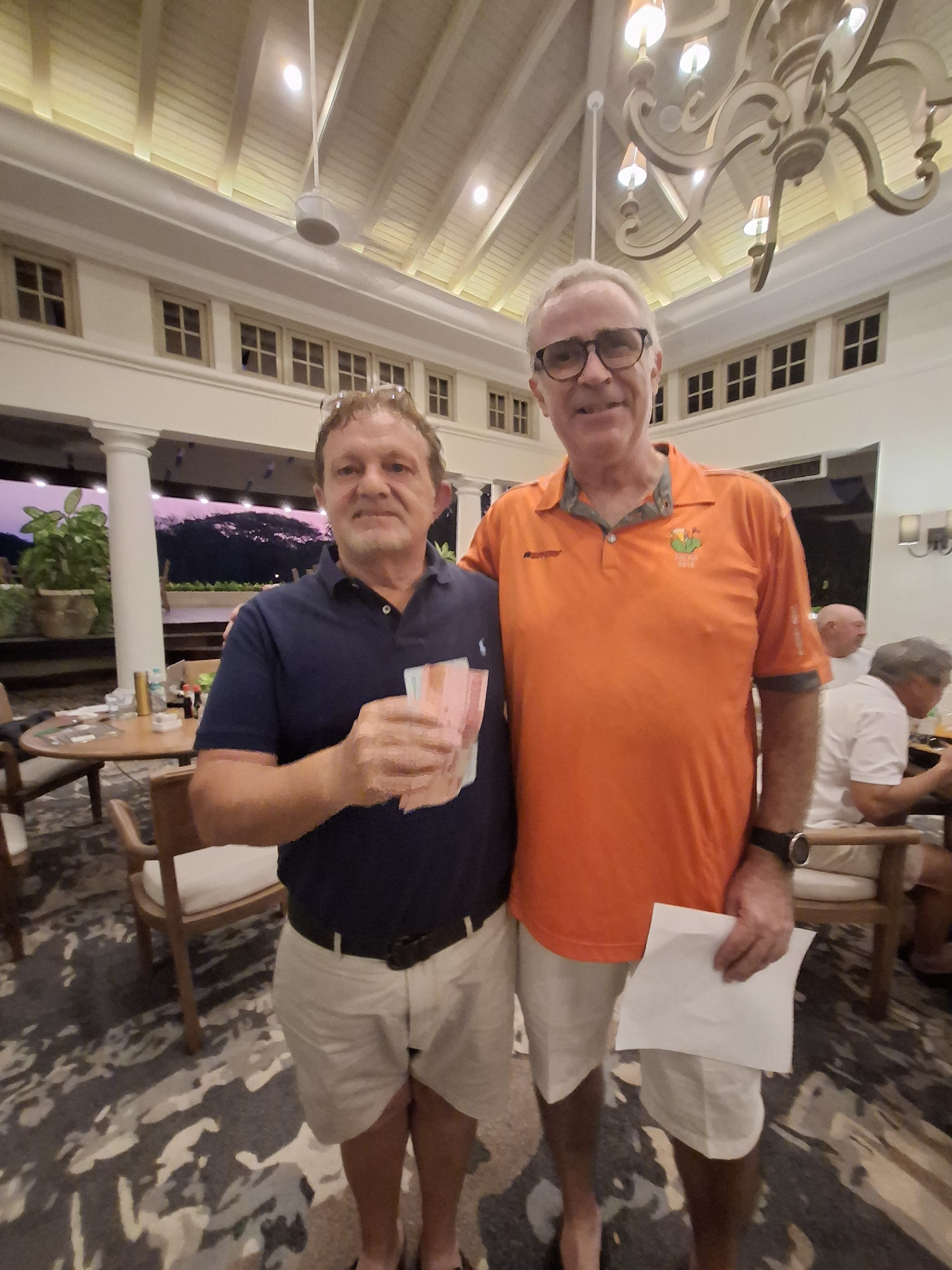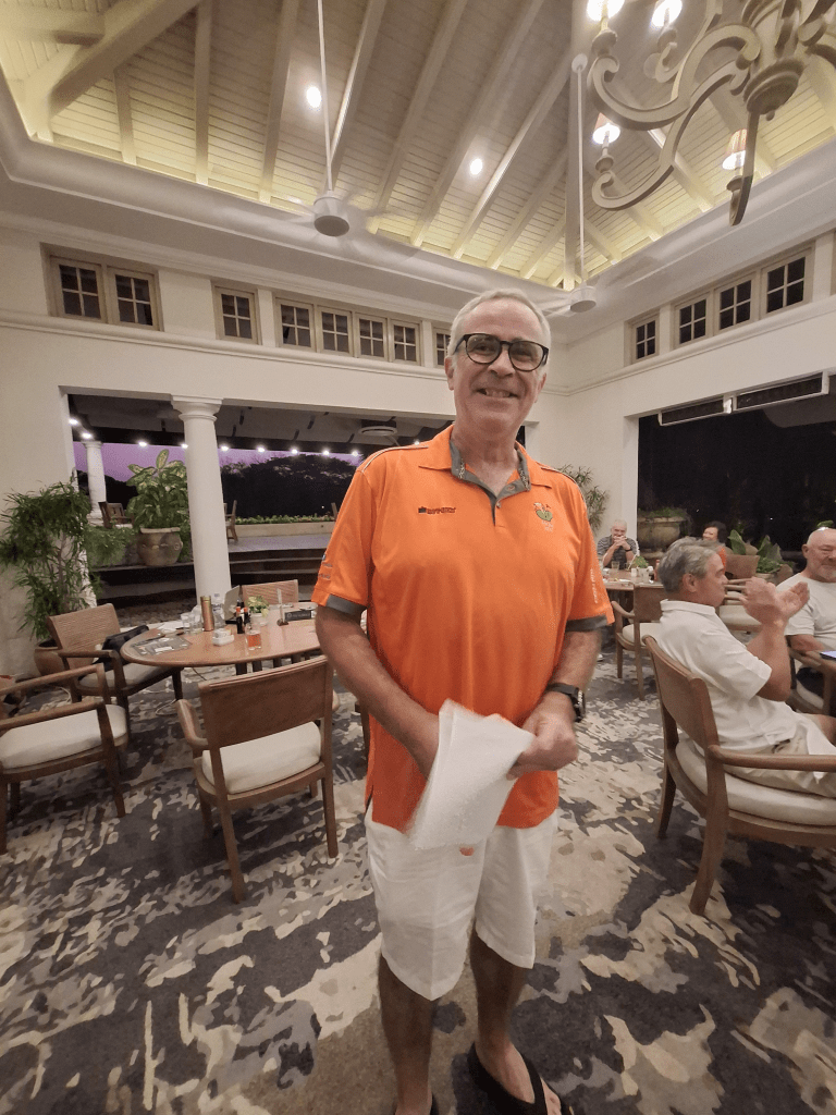 Back in the club house things were warming up Dean had seen a two hour delay to his flight to KL so was getting into his cups. The food and the booze was flowing The Sheard’s group finally arrived before the sun went down and onto the prizes we shall go.