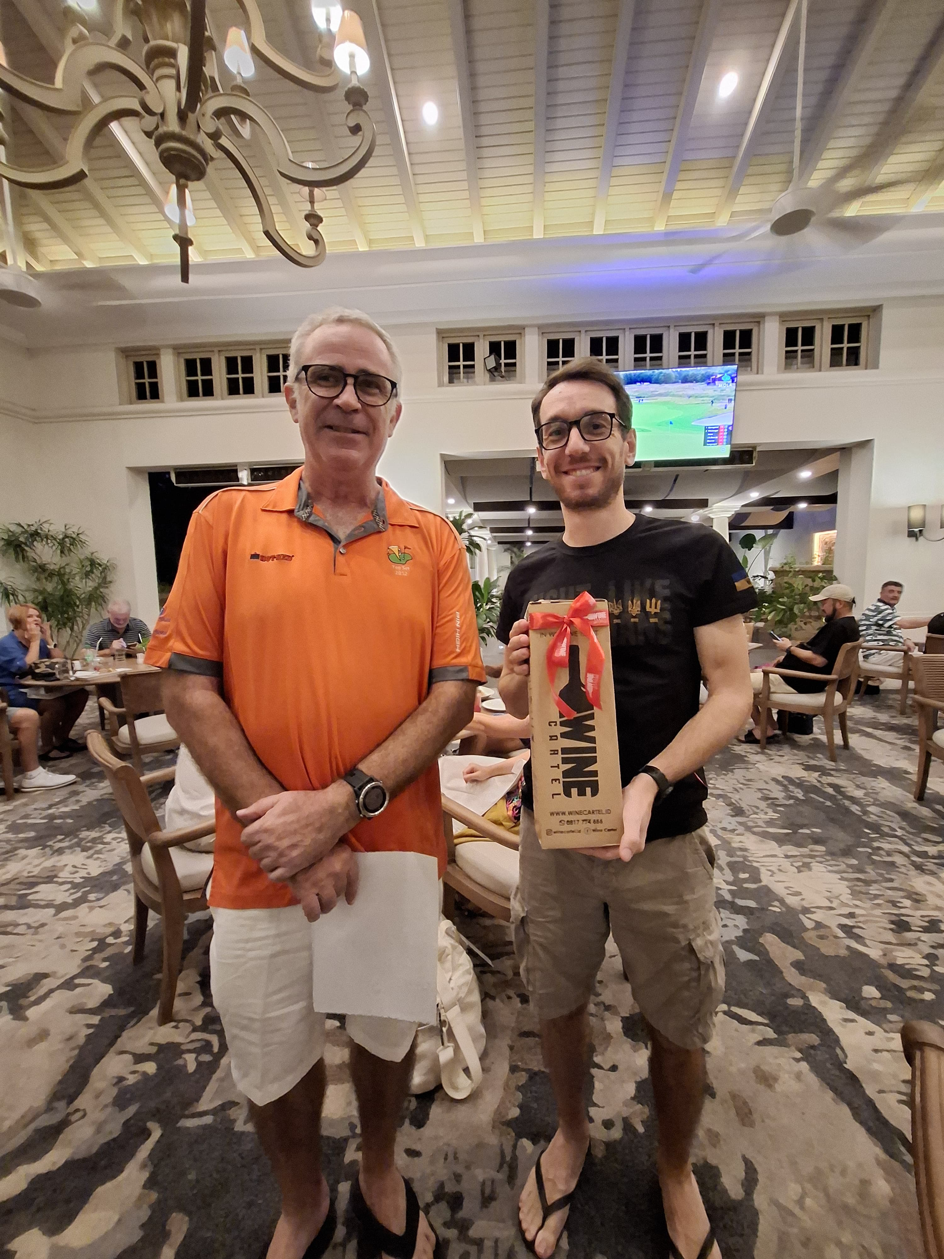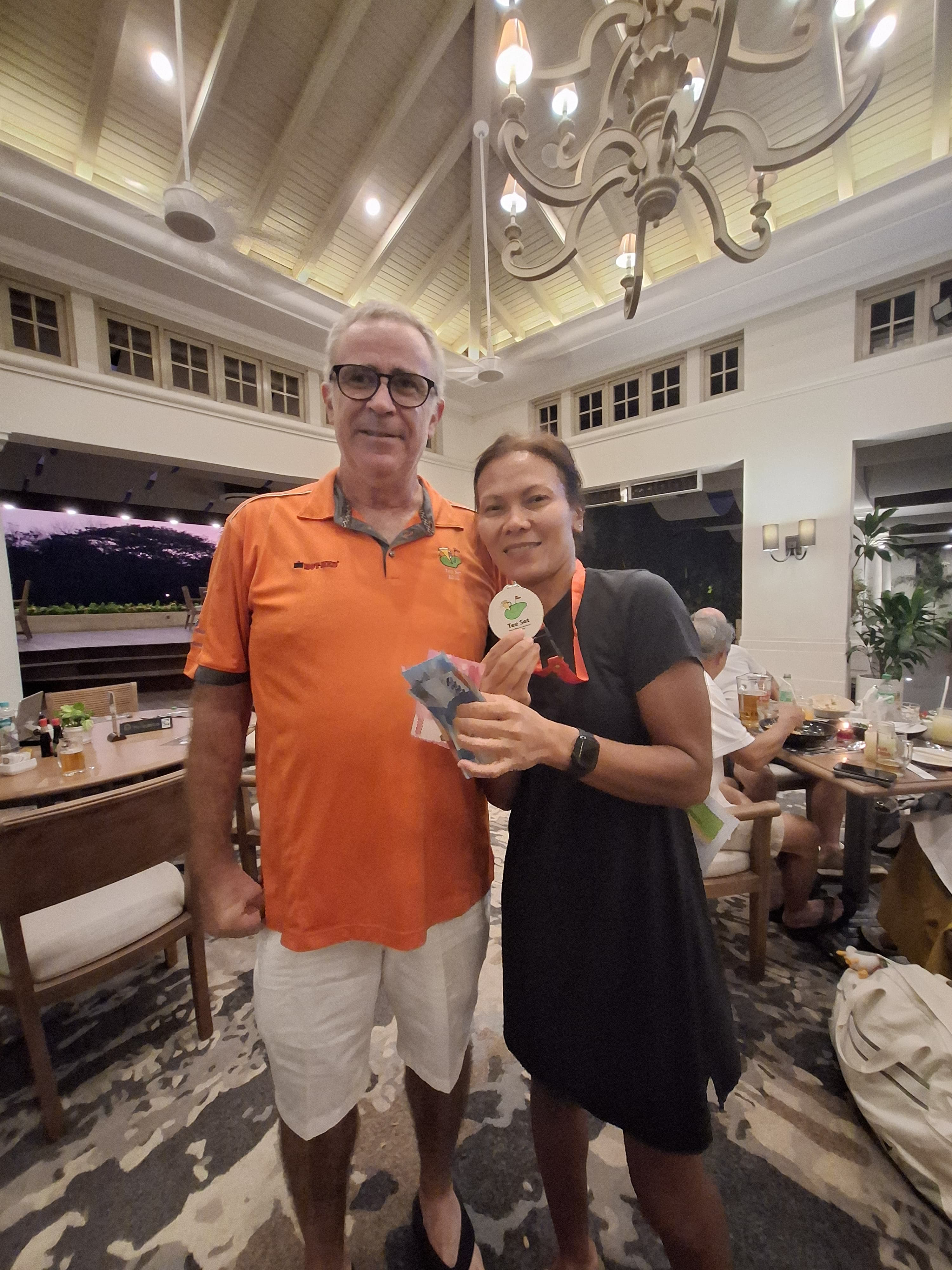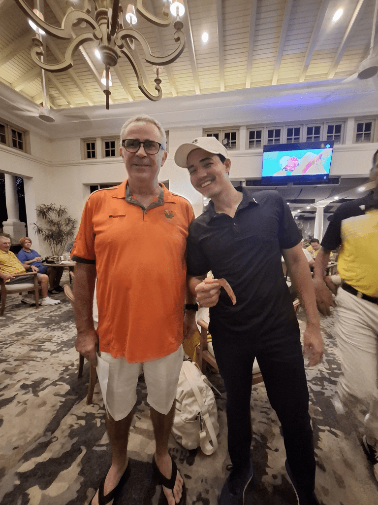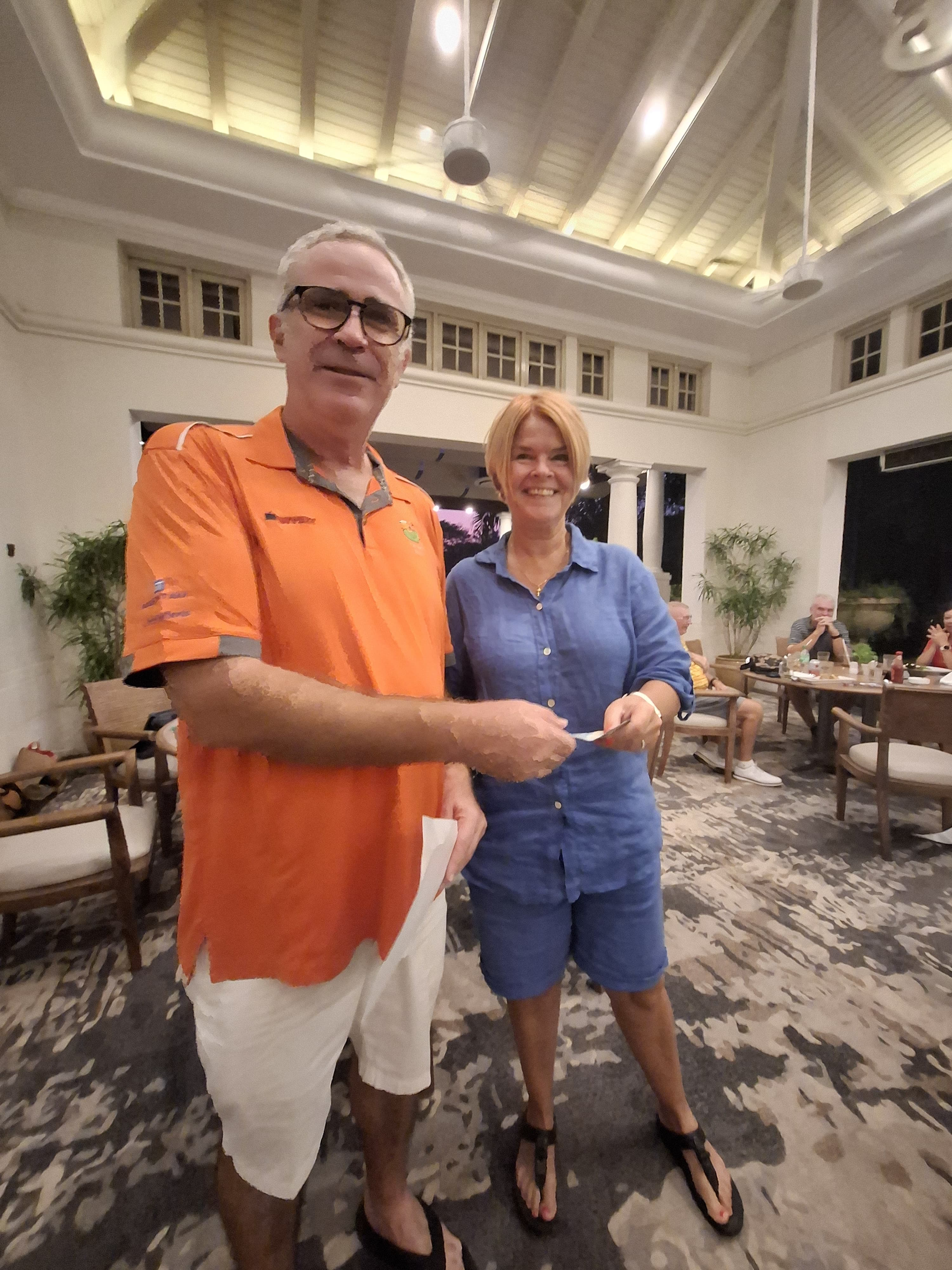 Back in the club house things were warming up Dean had seen a two hour delay to his flight to KL so was getting into his cups. The food and the booze was flowing The Sheard’s group finally arrived before the sun went down and onto the prizes we shall go.