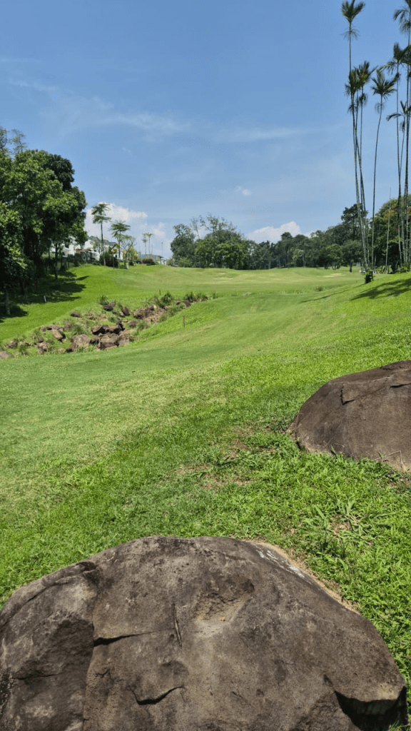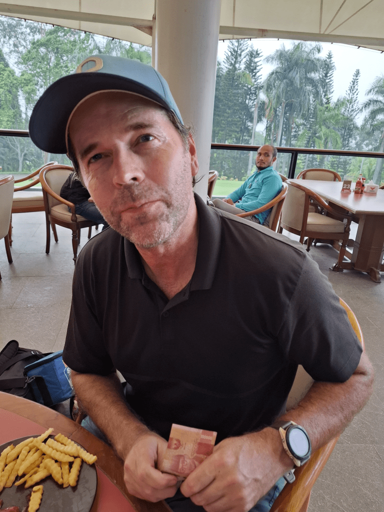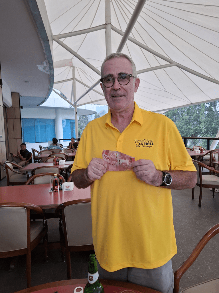 We soon caught the group in front of us where one of the players was having an on course lesson, but there speed of play was reasonable and as were were a 3 ball we should be close to them through the front 9 which was actually the back 9, if you know what I mean. The standard of play was improving as we worked our way around the course with Holger missing a very good score due to being a little bit short of juice on 4 or 5 putts that just stopped at the lip of the hole. The greens at Gunung Geulis have terrified many a golfer over the years but Jens managed a well controlled 31 putts, alas Shinta was a bit wayward and Tom wildly wayward, whereas Rosita was banging them in from 8 metres away.