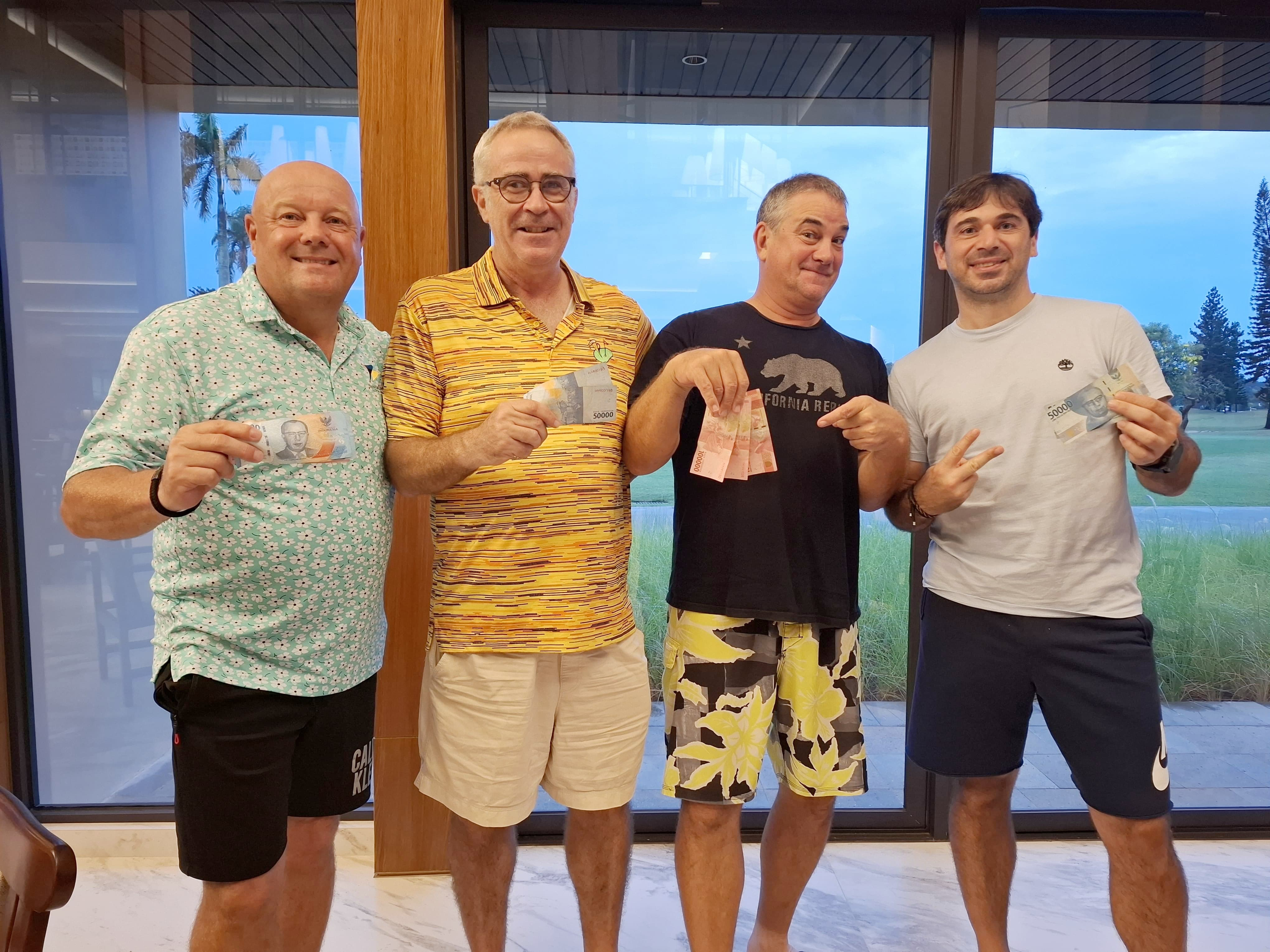 Here they all are from left to right. Low gross Ian with 77, Michael first sandy 18th, Bill 40 Stableford points, Alessandro a birdie on the 1st. Missing from this group is TeeSet’s favourite fairweather golfer, Axel, who nailed an eagle on his 4th hole.