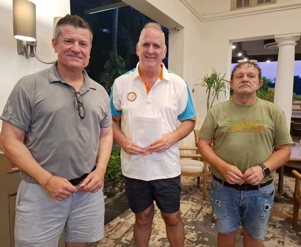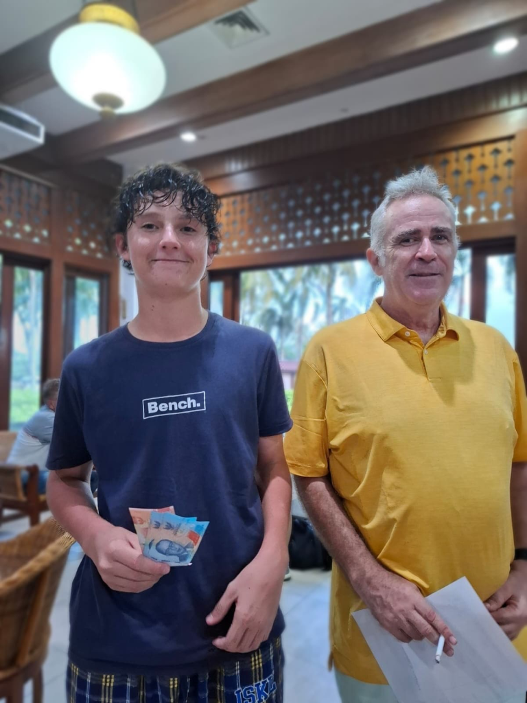 The ladies managed to keep their balls dry and all turned in good score cards. On the turn we were sat down for 20 minutes whilst a flight or 2 snuck in front. Players on the other side of the course included Carter and Andy. Andyput in a good round and we’ll save Carter for later. Axel took control at the start as things looked like getting out of control with the starter and the late Kedaton bookings. The weather was fine, the fairways varied from mushy to hard to the point a late lift clean and place announcement was made. To prove the point on the 18th Daniel hit a very good drive down the left side of the fairway and the ball was never to be seen again, undoubtedly plugged out of eye sight. The dry season will improve this course.