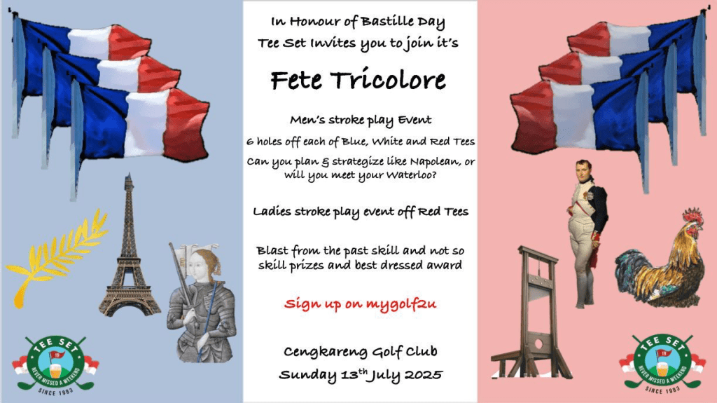 New on the calendar, TeeSet this weekend celebrates all things French. We play the colours of the flag. Women can elect to join the tri-colour round or play the day from the reds