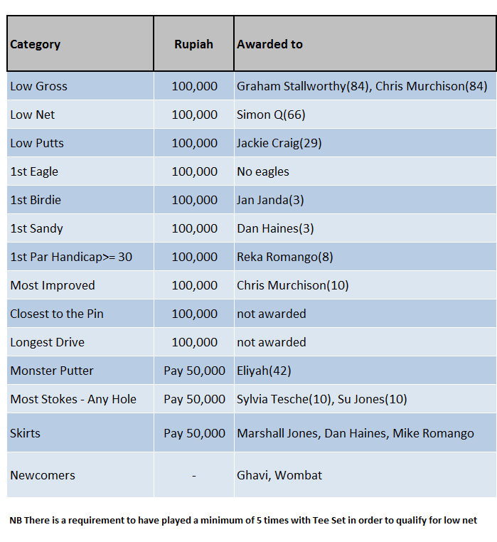 Joseph Peries headlined as so often, this time with a low gross of just three over par, while the Ladies recent good run continued with a low net 69 for Wina Nugraha – well done both.
