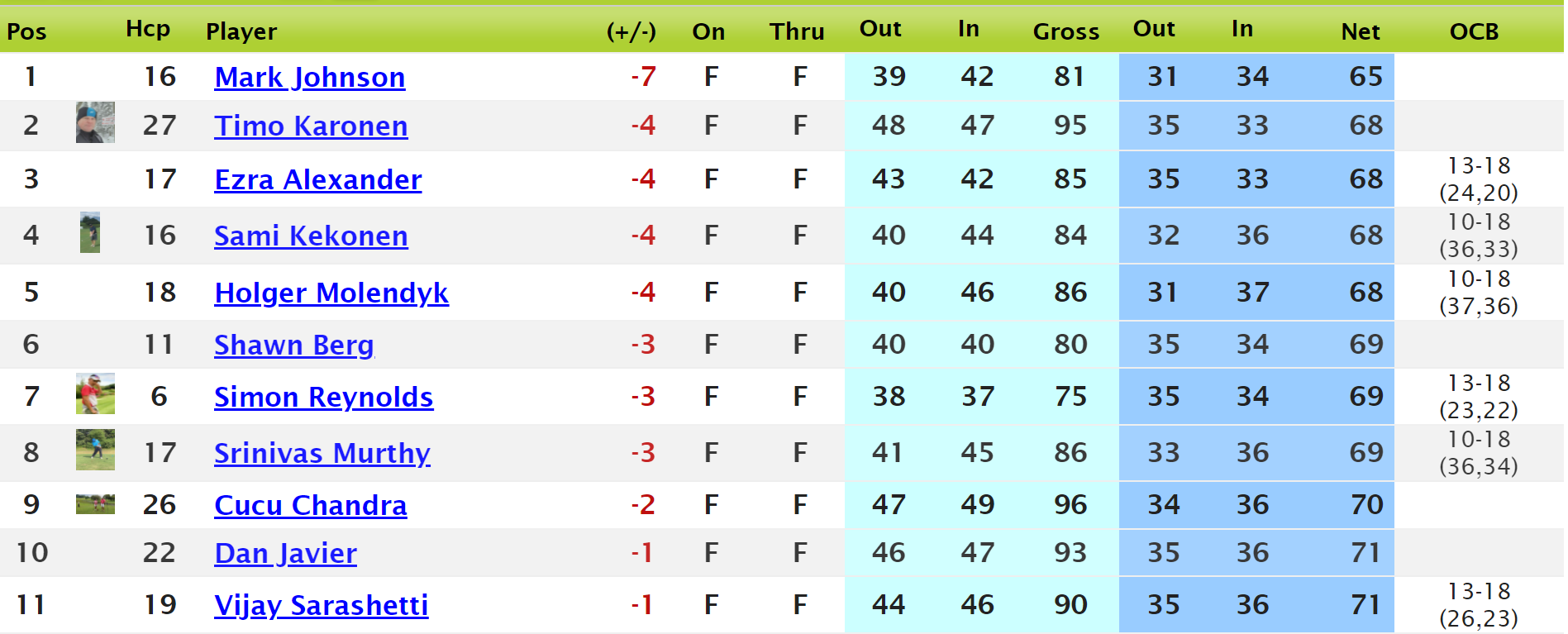 In the more humble Kuning (Yellow) Bracket, Sami and Mike battled it out on the first nine and then Sami started his back nine with three birdies and a par to leave Mike looking like a reindeer in his headlights. Mike scrambled back in his normal style but Sami took the match 4 & 3 to set up an All-Finn match with Timo for the Kuning Bracket, so either way we will have a Finn in the Final, continuing the proud tradition of fellow countryman and Tee Set matchplay champ, Jari in 2017.