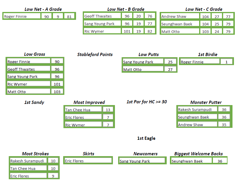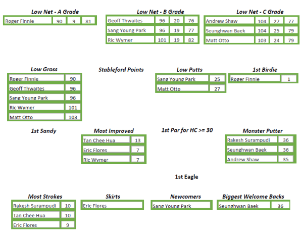 Being a regular Sunday we had our regular call up for skirts and so whilst they were spared a fine, Brad Burness, King Tirto, Mark Johnson and Paul Daud all got to parade in front of the assembled masses. Most Improved on the day went to James Ross and First Par Handicaps >=30 went to Timo Karonen. Anthony King took Low Putts and fellow playing partner Kees de Korver First Sandy whilst Doug McQuater and Emil Marcelo shared First Birdie.