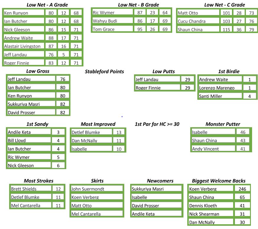 Low Putts went to Simon Oxley for his return of 26 strokes on the greens and First Birdie to Chris Lever for his effort on hole 5. Low Gross on the day went to Jeff Landau for his 79 off the stick.