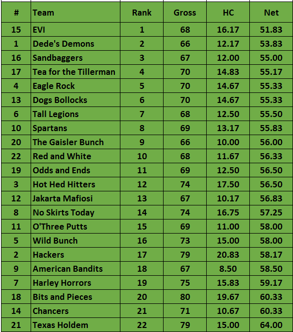 For the team prizes there were many good scores with 19 of the 22 teams finishing with a net score under 60. The battle for 3rd place was a close one with 7 teams separated by a single stroke.