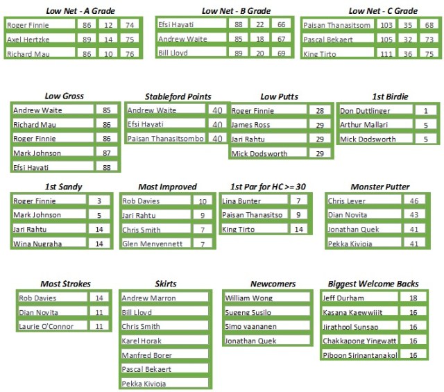 Low Net A Grade was awarded to Roger Finnie for his net 74, Low Net B Grade to Andrew Waite for his net 67 and Low Net C Grade to Paisan Thanasitsom for his net 68.