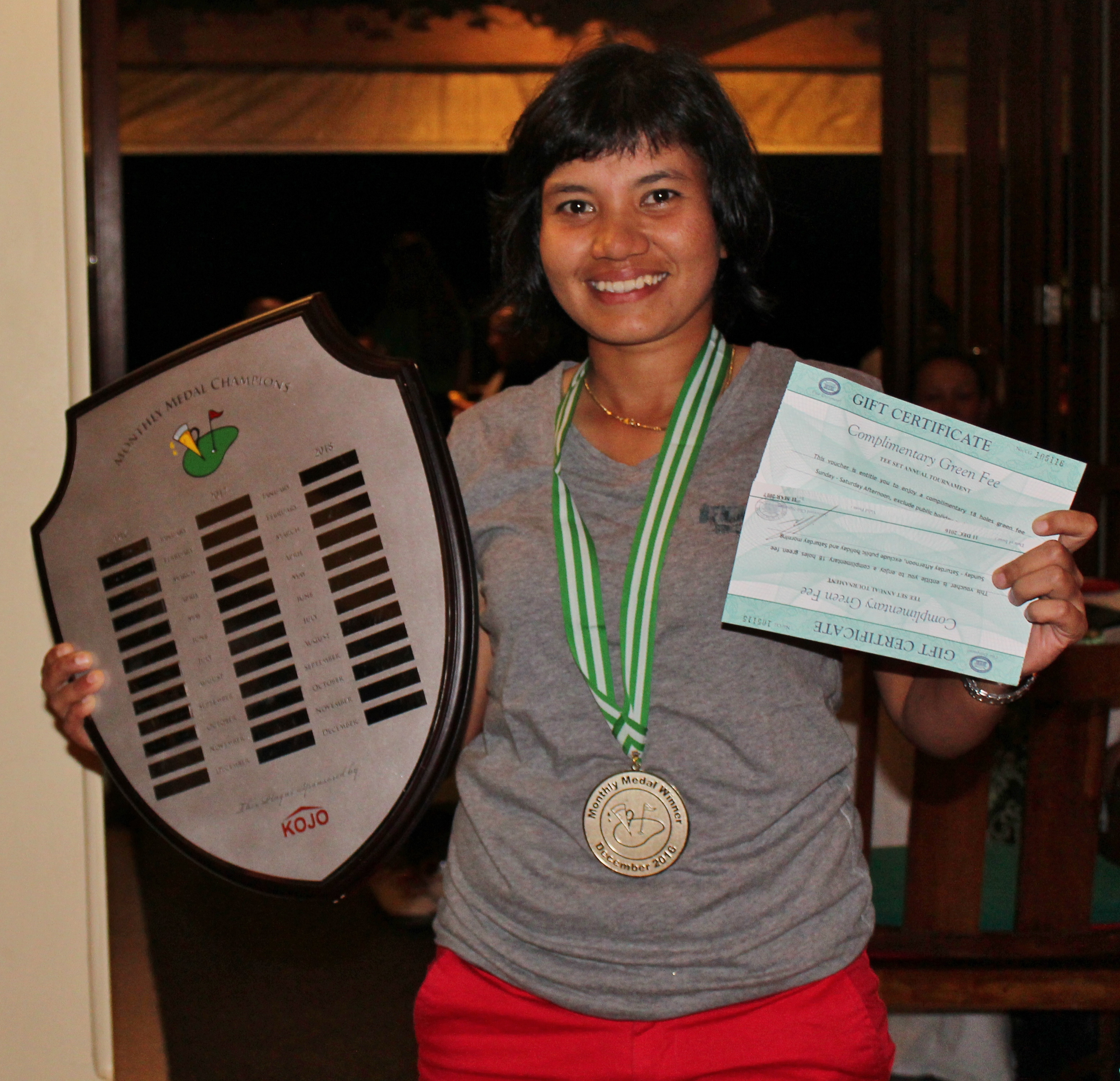 And the biggest prize of them all, the Monthly Medal, was won by Efsi Hayati with 42 stableford points after adjusting her scorecard with the proper hole indexes, leaving Andrew Waite and Paisan Thanasitsomboon as runners-up with their 40 points. For her brilliant performance Efsi not only earned a medal and her nameplate on the Monthly Medal Shield but also received 2 Cengkareng free weekend round certificates.