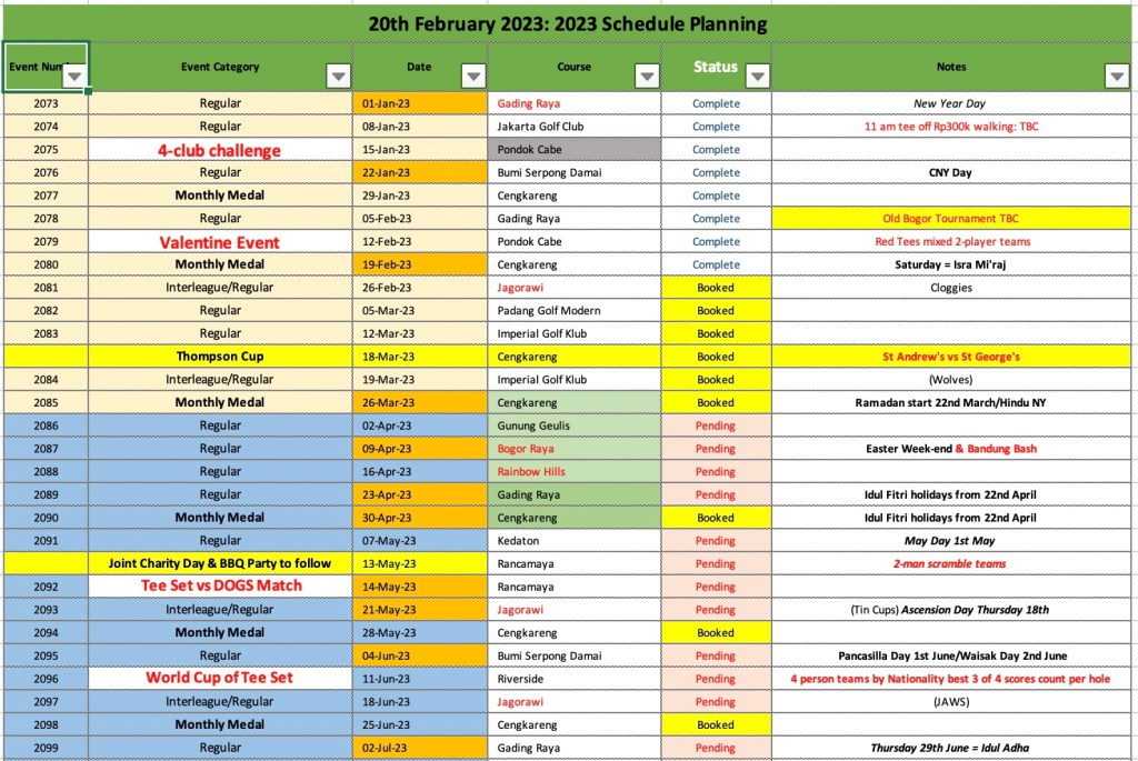 The preliminary schedule for the first half of 2023 is set out below. Please be aware that it is subject to change at short notice due to conditions outside our control such as courses holding a competition on the date previously arranged with them. Please keep up to date by being included on Tee Set’s WhatsApp group where last minute changes are posted and also by checking on the Mygolf2U app; Registration for any Tee Set event is open to everyone wishing to join us and please do so on the above app.