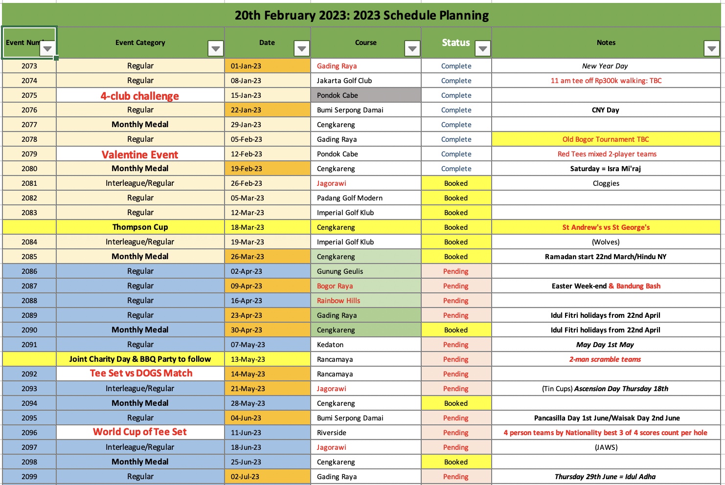The preliminary schedule for the first half of 2023 is set out below. Please be aware that it is subject to change at short notice due to conditions outside our control such as courses holding a competition on the date previously arranged with them. Please keep up to date by being included on Tee Set’s WhatsApp group where last minute changes are posted and also by checking on the Mygolf2U app; Registration for any Tee Set event is open to everyone wishing to join us and please do so on the above app.